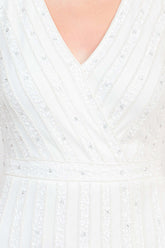 Shimmer with sophistication in a silhouette designed to captivate at every formal occasion. This wholesale Adrianna Papell Dress features a flattering V-neckline, sleeveless cut, and intricate beading and sequins that add radiant sparkle. The banded waist and front slit enhance the figure, while the soft mesh overlay and zipper back ensure both elegance and comfort—perfect for weddings, galas, and evening celebrations.
